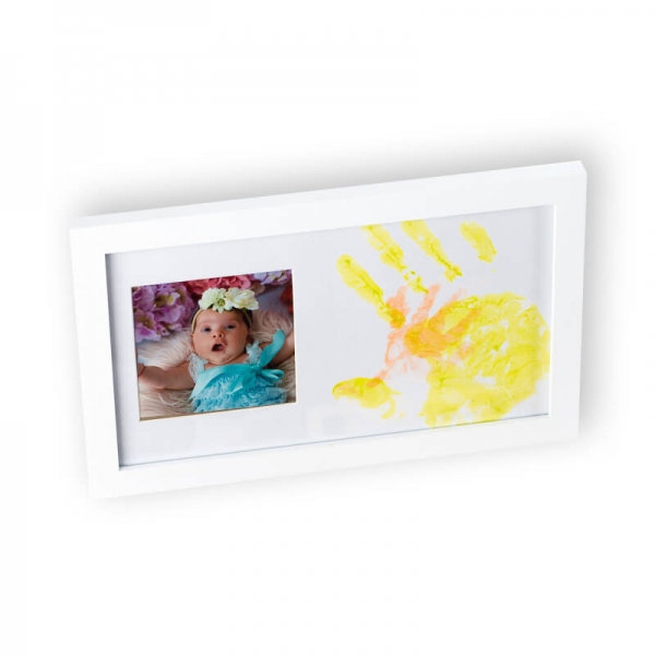 2 culori de vopsea pe baza de apa pentru ca aceasta nu contine compusi toxici ce pot afecta sanatatea copiilor, o plansa alba pentru amprente, si o rola pentru a intinde vopseaua pe palma.